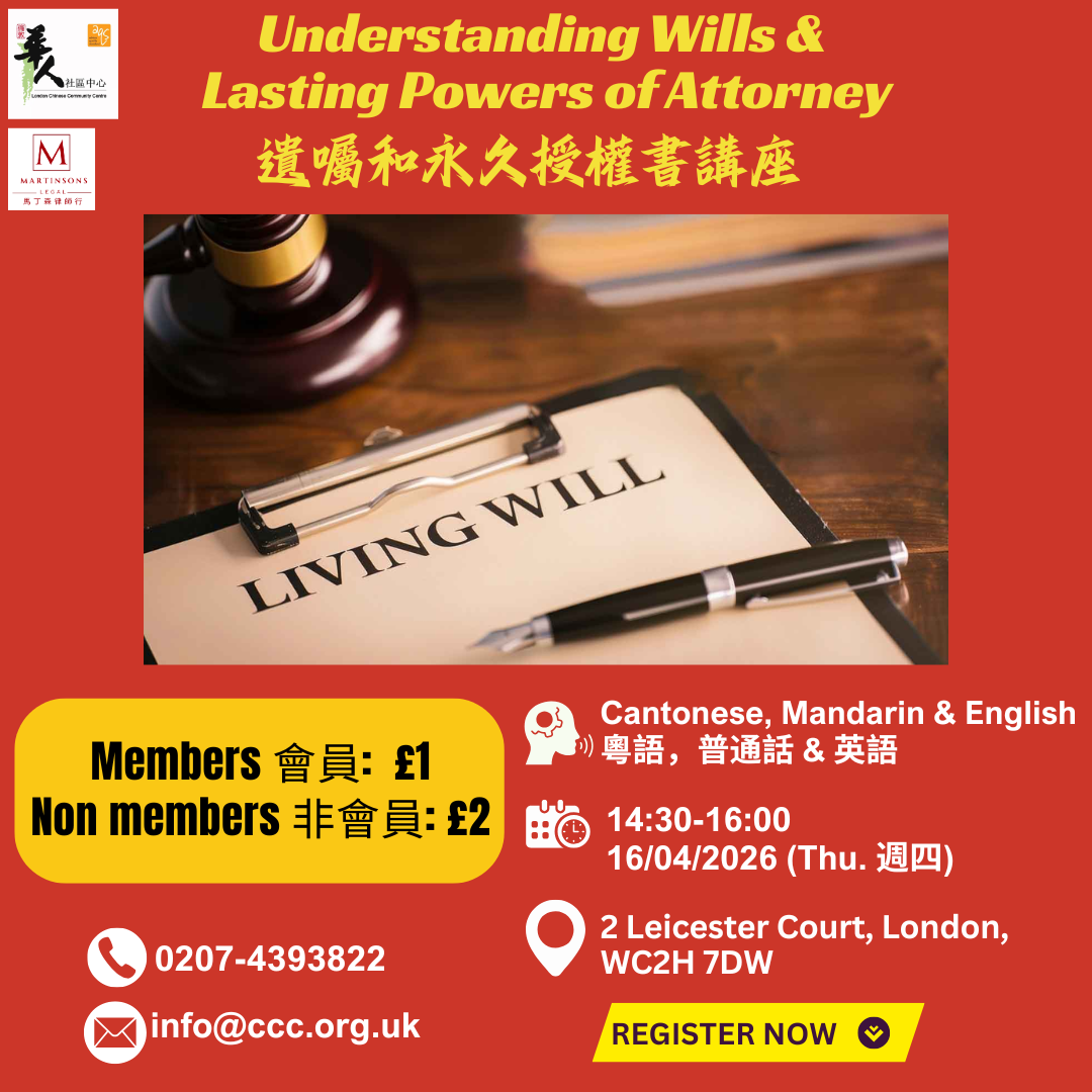 誠邀參加我們即將舉辦的遺囑和永久授權書講座  , 華人社區中心 (CCC) 現與 Martinsons Legal LLP 合作,助您精明地保障家人的未來,讓您免除後顧之憂。專業律師將棄用艱澀的法律術語,以簡單、清晰、明確的步驟,教您如何守護家族傳承。